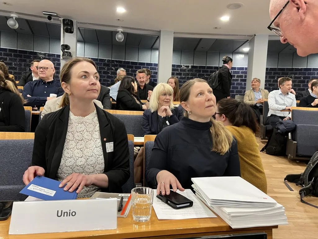 Forhandlingsleder Guro Lind og utvalgssekretær Andrea Mandt i Unio stat i samtale med Statens personaldirektør Gisle Norheim da forhandlingene åpnet den 20.april. Nå har Unio stat brutt forhandlingene, og lønnsoppgjøret går til Riksmekleren. Foto: Nora Sørensen/Unio